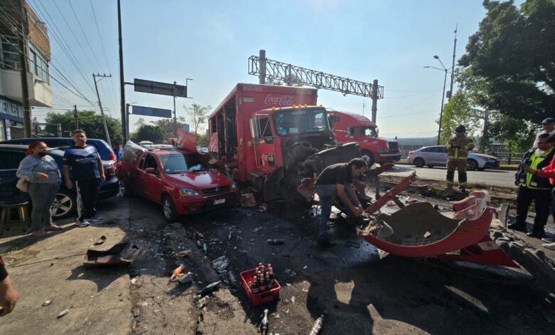 Morelia, Mich.- Miércoles 24 de diciembre de 2025. Un camión repartidor de Coca-Cola protagonizó un aparatoso accidente esta mañana en el Periférico Paseo de la República, en la zona norponiente de la ciudad. Según versiones preliminares, el conductor habría dado un brusco volantazo para esquivar a otro vehículo que se le atravesó, lo que provocó que la unidad se estrellara contra un poste metálico. El impacto fue tan fuerte que parte de la carga de refrescos salió despedida, cayendo sobre una camioneta estacionada y empujándola contra un tercer auto.