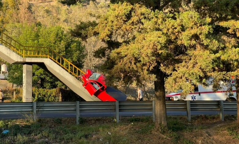Huiramba, Mich.- 21 de febrero de 2026. Una camioneta tipo Ram 700 de color rojo protagonizó un aparatoso accidente en la carretera Morelia-Pátzcuaro, específicamente en el tramo Huiramba-Cuanajo. El vehículo, que circulaba a alta velocidad, perdió el control e impactó contra la escalera de un puente peatonal, con tal fuerza que quedó parcialmente montada sobre el barandal. El siniestro dejó como saldo una persona lesionada y daños materiales considerables.