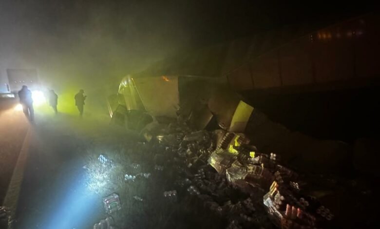 Carambola de tráilers en neblina: bebidas y autos en cuneta