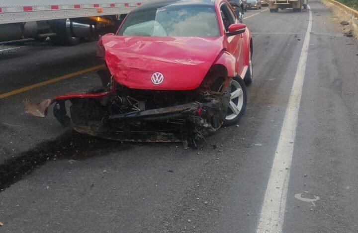 Uruapan, Mich.- 24 de octubre de 2025. Un violento accidente en la autopista Uruapan-Pátzcuaro dejó como saldo cuatro personas con lesiones de consideración. El siniestro ocurrió cerca del puente de Calicanto, específicamente en el kilómetro 4, donde un Volkswagen Beetle rojo y una camioneta Ford de doble rodado colisionaron de manera frontal, provocando que esta última terminara volcada sobre la carretera.