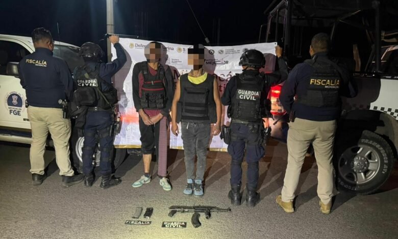 En un operativo posterior, elementos de la Fiscalía General del Estado y de la Guardia Civil detuvieron a dos hombres heridos por impacto de bala, a quienes les aseguraron un fusil, dos cargadores y chalecos balísticos. Uno de los detenidos tenía una orden de aprehensión vigente por homicidio. Ambos recibieron atención médica y fueron puestos a disposición de la autoridad ministerial, mientras el cuerpo del fallecido fue trasladado a la morgue para su necropsia y espera de identificación.