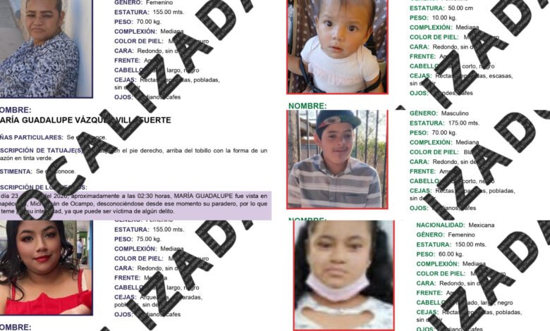 Las personas localizadas son María Guadalupe Vázquez Villafuerte, de 43 años; Alondra Vázquez Villafuerte, de 18 años; Lucía V.V., de 15 años; Leonardo G.V., de 14 años; y Nayra Ximena V.V., de un año de edad. Todas fueron reportadas como desaparecidas el 23 de abril de 2026, lo que activó una investigación urgente por parte de la Fiscalía Especializada para la Investigación y Persecución de los Delitos de Desaparición Forzada de Personas y Desaparición Cometida por Particulares.