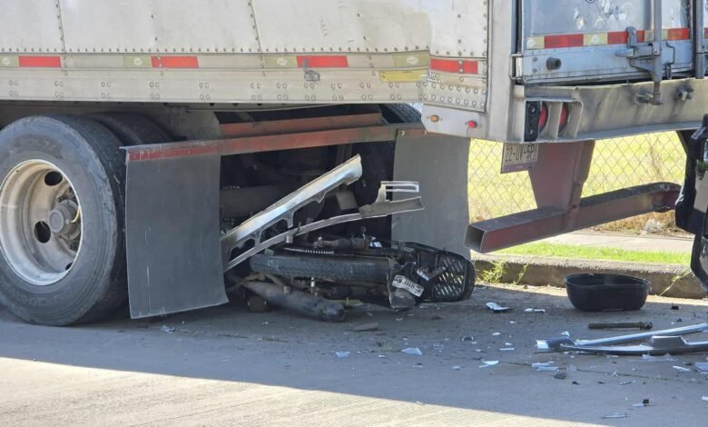 Zamora, Mich.- 27 de septiembre de 2025.- Un trabajador municipal que se desplazaba en su motocicleta vivió un verdadero milagro cuando fue impactado por una camioneta que lo proyectó directamente debajo de un tráiler estacionado. El violento choque ocurrió en la Avenida Ferrocarril, frente al Fraccionamiento Kuntani, donde testigos presenciaron con horror cómo el motociclista quedó atrapado bajo el pesado vehículo.