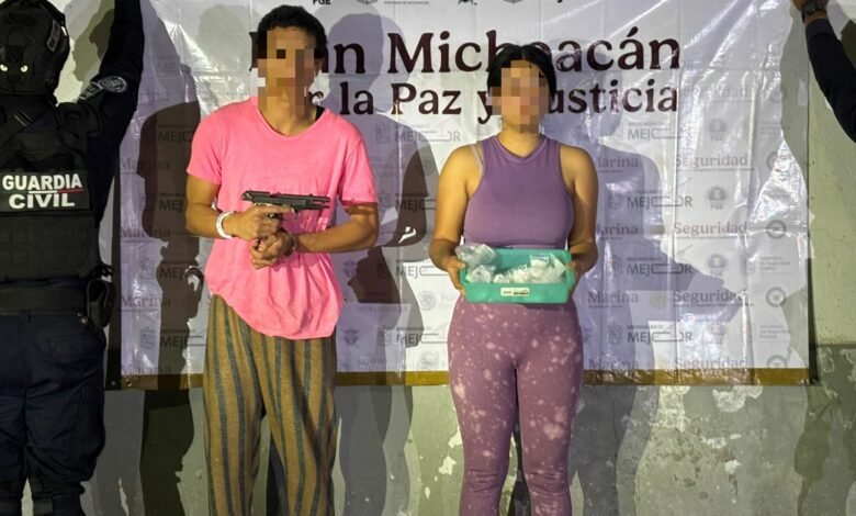Uruapan, Mich.- 15 de enero de 2026. Una pareja fue detenida por elementos del Grupo Motorizado de la Guardia Civil mientras transportaba 255 gramos de metanfetamina (crystal) y una pistola calibre .9 milímetros. Los sujetos, identificados como Edgar Adrián G. R. y María de Jesús Z. C., viajaban en un automóvil Volkswagen color café cuando intentaron darse a la fuga al notar la presencia policial en la Avenida de Las Torres, entre las colonias Valle Dorado y Doctores.