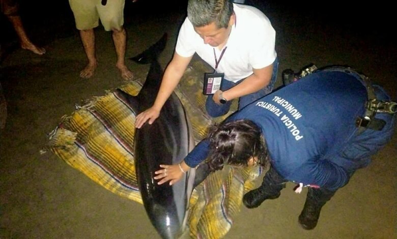 Lázaro Cárdenas, Mich.- 18 de octubre de 2025. Un inusual varamiento movilizó a autoridades ambientales y pescadores locales cuando un delfín listado fue encontrado desorientado en las arenas de Playa Tortuga. El mamífero marino, de la especie Stenella coeruleoalba, yacía en la orilla en lo que parecía ser un estado de confusión, generando inmediata preocupación entre los testigos del hallazgo. La rápida intervención evitó una tragedia mayor para este ejemplar que misteriosamente se separó de su manada.