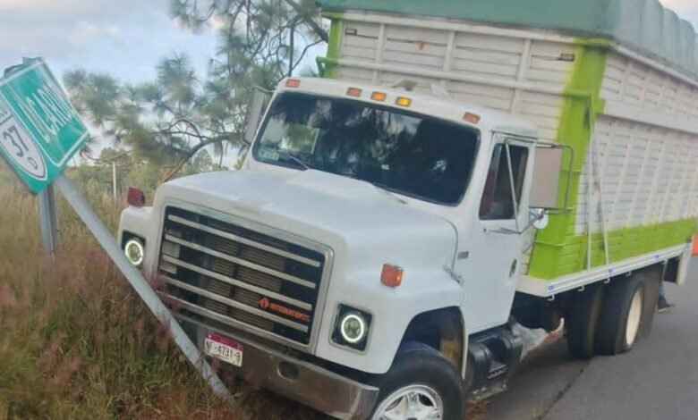 Salvador Escalante, Michoacán – Jueves 04 de diciembre de 2025. Un camión tipo tortón de la marca International, con matrícula NF4731B, protagonizó un aparatoso accidente en la autopista Siglo XXI, específicamente en el kilómetro 73 del tramo Pátzcuaro-Uruapan. Según reportes policiales, el vehículo salió de manera intempestiva de la carretera para finalmente estrellarse contra un letrero metálico. Aunque el incidente causó alarma, las autoridades confirmaron que el conductor, identificado como Erick de 38 años, solo resultó con lesiones leves.