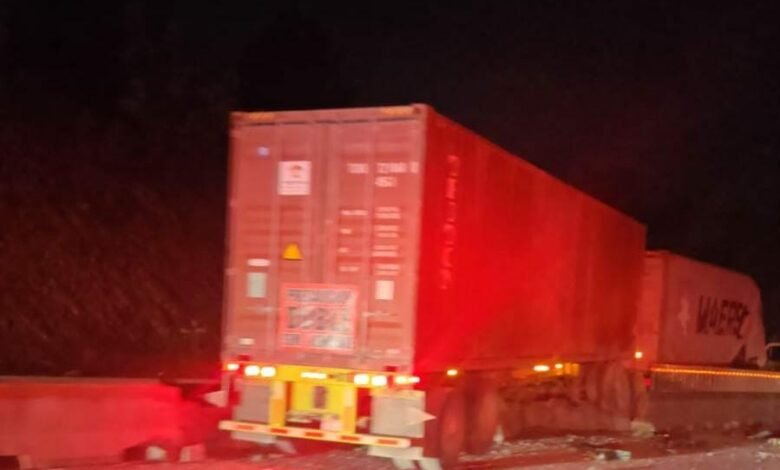 Ziracuaretiro, Mich.- 06 de diciembre de 2025. En un hecho que pudo terminar en tragedia, tres camiones de carga protagonizaron un choque múltiple durante la madrugada del sábado en la autopista Siglo XXI. El accidente ocurrió en el kilómetro 78+500 del tramo Pátzcuaro-Uruapan, involucrando a un tráiler International, un tractocamión Kenworth y un camión nodriza Peterbilt. Las unidades quedaron completamente atravesadas, bloqueando la circulación en ambos sentidos y generando un escenario de caos vial en plena madrugada.