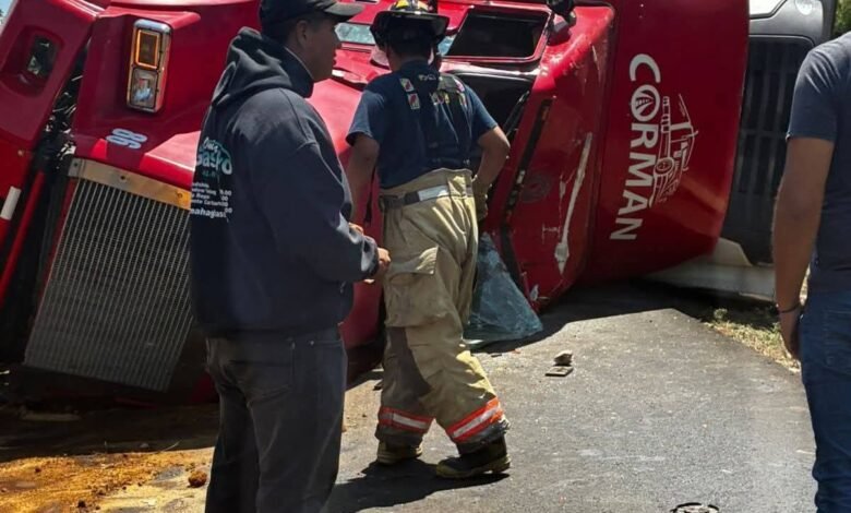 Uruapan, Michoacán. 02 de abril de 2026. Un tractocamión se volcó esta tarde en la carretera libre Uruapan-Lombardía, cerca del Rastro Municipal, dejando como saldo dos personas lesionadas. El accidente, descrito como aparatoso, ocurrió cuando el conductor perdió el control de la pesada unidad, presuntamente por exceso de velocidad mientras se dirigía a Lombardía. Automovilistas alertaron a los servicios de emergencia sobre el siniestro.